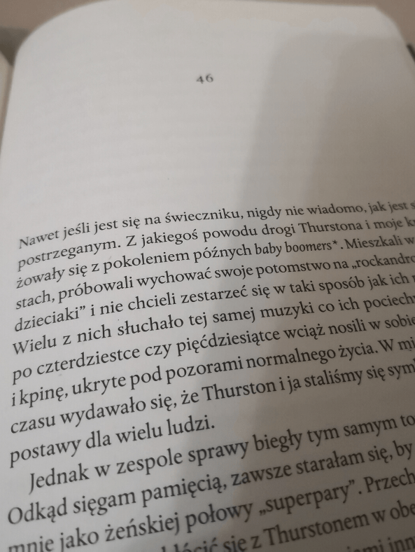 Ostatnim ważnym wątkiem, mocno autoterapeutycznym, jest opis związku Gordon z Thurstonem Moorem. Znajdziemy tu okoliczności poznania tej pary, wspólne życie na scenie i poza nią, ale też bolesne dla artystki kulisy rozstania. Widać, że Kim przepracowuje tutaj traumę: tragedię osoby oszukanej, opuszczonej i zdradzonej. Próbuje poukładać sobie w głowie i na naszych oczach to, jak docenić wszystkie te lata spędzone z człowiekiem, który w ostatecznym rozrachunku okazał się być kimś innym, niż myślała. Od razu uprzedzam, że w żadnym momencie nie wychodzą z tego „gorzkie żale”. Nie znajdziemy tu też zbyt dużej ilości szczegółów; do tego Gordon w wielu miejscach wypowiada się o swoim byłym życiowym partnerze w sposób ciepły. Czuć jednak, że w momencie rozpoczęcia pisania książki jej twórczyni nie przepracowała wszystkich uczuć związanych z tym rozstaniem. Mam jednak nadzieję i tak też czuję, że będąc przy końcu była na dobrej drodze do tego, by jej się to udało.
